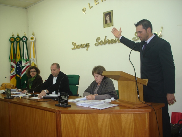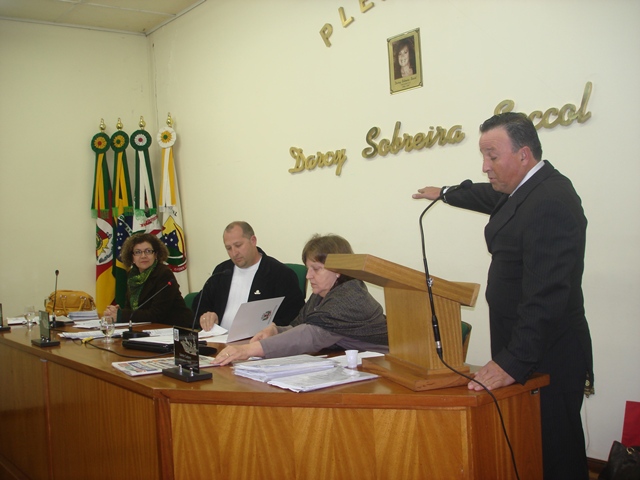 A Sessão Ordinária desta segunda-feira, 19 de agosto, iniciou com duas novidades na composição legislativa. Pela primeira neste mandato, os suplentes Adriano Apolinário (DEM) e Roberto Dalmas (PSB) tomaram posse e atuarão até o final deste mês, quando encerra o prazo de licença dos titulares Paulo Massolini e Nelson Mezzomo. Com as licenças do 1º Secretário e também do 2º Secretário, a Vereadora Salete Cadore foi convidada para cumprir com estas funções, inclusive ocupando um dos lugares na Mesa Diretora.